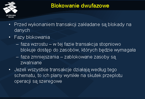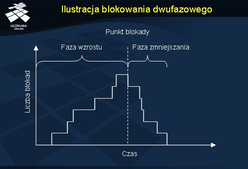 Algorytm blokowania dwufazowego składa się z dwóch faz: fazy wzrostu (ang. growing phase ) oraz fazy zmniejszania (ang. shrinking phase ). W pierwszej fazie transakcja może blokować zasoby, ale nie wolno jej zwalniać zasobów, które wcześniej już zablokowała. W drugiej fazie transakcja może zwalniać zasoby, lecz nie wolno jej blokować żadnych nowych zasobów. Jeżeli proces nie chce modyfikować danych dopóki nie osiągnie momentu przed fazą zmniejszania, to w razie niepowodzenia przy zakładaniu jakiejś blokady może on zwolnić wszystkie blokady i rozpocząć ponownie algorytm.