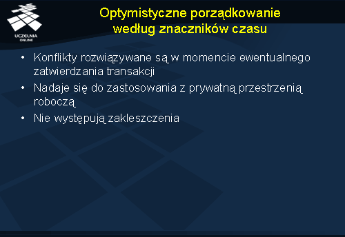 Zwróćmy uwagę, że wraz z zastosowaniem takiego podejścia do sterowania współbieżnością, można wykorzystać w transakcjach prywatną przestrzeń roboczą. W ten sposób każda transakcja może działać lokalnie bez przejmowania się innymi transakcjami.