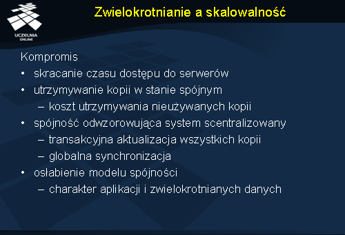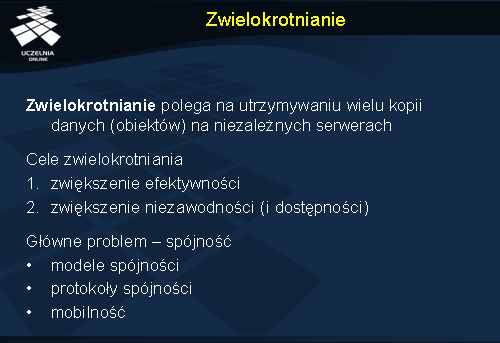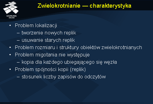 Problemem specyficznym dla zwielokrotniania jest natomiast spójność danych. Istnienie wielu kopii jest korzystne z punktu widzenia procesów czytających, ale staje się sporym problemem dla systemu, gdy zachodzi konieczność aktualizacji tych wszystkich replik.