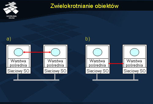 Druga metoda (rysunek b) zakłada, że obiekty nie są świadome zwielokrotniania, co oznacza, że cały ciężar zarządzania spójnością spada na warstwę pośrednią (ang. middleware ). System musi w tym przypadku zagwarantować globalne uporządkowanie wszystkich wywołań metod na wszystkich obiektach, co nie zawsze jest konieczne. Jest natomiast wygodne dla programistów samych obiektów, ponieważ nie muszą ich programować w żaden specjalny sposób.