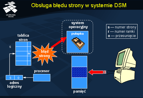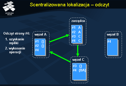 Realizacja operacji dostępu do danych w przypadku stosowania rozproszonej statycznej lokalizacji wygląda bardzo podobnie. Jedyna różnica polega na wyborze węzła, który pełni rolę zarządcy. Komunikat lokalizujący stronę wysyłany jest do węzła, któremu przypisano funkcję zarządzania odpowiednią stroną, a nie do centralnego zarządcy.