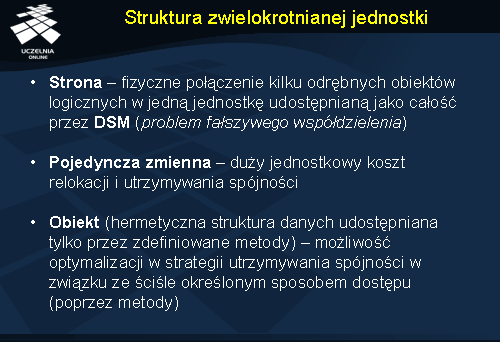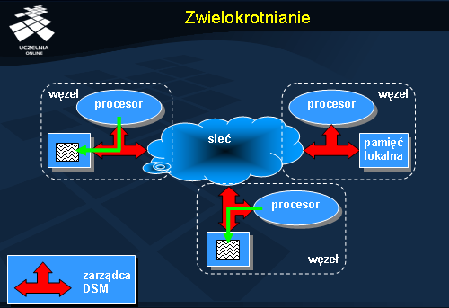 Trzecie rozwiązanie polega na zastosowaniu zwielokrotniania ; obiekt logiczny może być jednocześnie zlokalizowany fizycznie w pamięci lokalnej wielu węzłów, co umożliwia równoległy dostęp do tego obiektu w wielu węzłach. Podstawowym problemem jest w tym przypadku sygnalizowana wcześniej spójność danych.