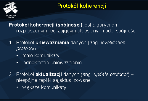 Drugim podejściem stosowanym w protokołach koherencji jest aktualizacja (ang. update protocol ). Polega ona na każdorazowym przesyłaniu komunikatu aktualizującego stan repliki. Komunikat taki może zawierać całość zaktualizowanego stanu obiektu lub jedynie zmianę względem poprzedniej wersji. W podejściu tym przesyłane komunikaty są większe, bo muszą zawierać również aktualizowane dane. Komunikaty muszą również być wysyłane praktycznie po każdej aktualizacji, chyba, że z własności modelu wynika, że dane te nie będą wykorzystywane, co pozwala na zgrupowanie kilku aktualizacji w jednym komunikacie (grupowanie takie może też dotyczyć kilku aktualizacji różnych obiektów). Zaletą tego rozwiązania jest natychmiastowa dostępność zaktualizowanych replik w poszczególnych węzłach. Może się jednak zdarzyć, że aktualizacje te nie będą w ogóle odczytywane.