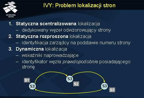 Trzecie rozwiązanie to zastosowanie dynamicznej lokalizacji. Jest to podejście oparte na wskaźnikach naprowadzających, opisywanych na wykładzie dotyczącym nazewnictwa. Każdy węzeł posiada tablicę odwzorowującą lokalizację poszczególnych stron. Tablica ta nie koniecznie zawiera aktualne i prawdziwe informacje. Jest to informacja o prawdopodobnej lokalizacji stron. Lokalizacja strony polega na wysłaniu zapytania do serwera, który jest podejrzewany o jej przechowywanie. Jeżeli jest to prawdą, odesłany zostanie komunikat z potwierdzeniem. Jeżeli nie, zapytanie zostanie przesłane do węzła, który jest podejrzewany przez węzeł właśnie odpytywany, itd. Na rysunku węzły oznaczone są etykietami w kwadratach. Węzeł S1 wysyła zapytanie do S2, bo podejrzewa właśnie S2 o posiadanie poszukiwanej strony. S2 jednak jej nie posiada i przekazuje zapytanie do S3, bo podejrzewa właśnie S3. S3 faktycznie stronę posiada i odpowiada węzłowi S1.