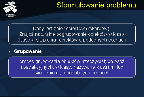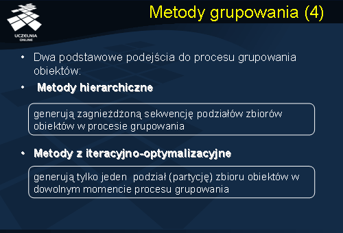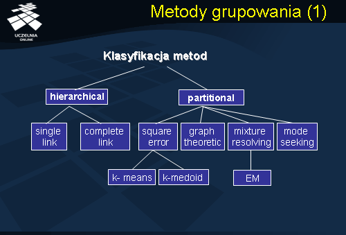 Podstawowa klasyfikacja algorytmów grupowania, do której najczęściej się odwołujemy i będziemy się odwoływać, to klasyfikacja, która dzieli algorytmy grupowania ze względu na przyjęty mechanizm grupowania. Wyróżniamy dwa zasadnicze podejścia do procesu grupowania obiektów: podejście hierarchiczne oraz podejście optymalizacyjno-iteracyjne. Algorytmy należące do pierwszej grupy metod generują zagnieżdżoną sekwencję podziałów zbiorów obiektów w procesie grupowania. Algorytmy należące do drugiej grupy metod generują tylko jeden podział (partycję) zbioru obiektów w dowolnym momencie procesu grupowania. Przejdziemy obecnie do przestawienia idei algorytmów grupowania hierarchicznego.