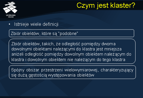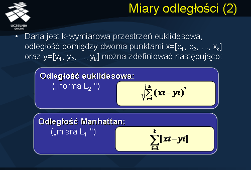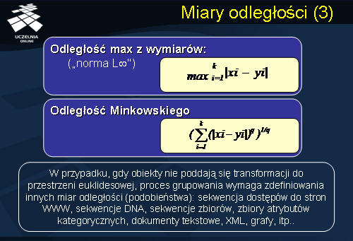 Jeżeli grupowane obiekty można przedstawić w postaci k-wymiarowych wektorów liczbowych, wówczas każdy obiekt można traktować jako punkt w k-wymiarowej przestrzeni euklidesowej i za miarę odległości można przyjąć dowolną z tradycyjnych miar stosowanych dla tej przestrzeni. Najpopularniejsze miary odległości punktów w przestrzeni euklidesowej to odległość euklidesowa (tzw. norma L2), odległość Manhattan (tzw. norma L1), maksimum z wymiarów (tzw. norma L?), czy odległość Minkowskiego. Łatwo zauważyć, że wszystkie z podanych miar spełniają aksjomaty metryki odległości. Niestety, w przypadku, gdy obiekty nie poddają się transformacji do przestrzeni euklidesowej, proces grupowania wymaga zdefiniowania innych miar odległości (podobieństwa). Dotyczy to takich obiektów jak: sekwencje dostępów do stron WWW, sekwencje DNA, sekwencje zbiorów, zbiory atrybutów kategorycznych, dokumenty tekstowe, XML, grafy, itp. Przedstawimy obecnie kilka wybranych miar odległości stosowanych do grupowania wymienionych wyżej typów obiektów.