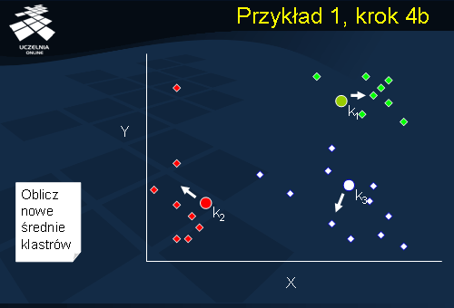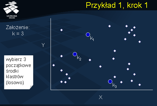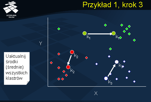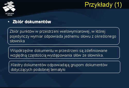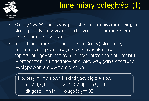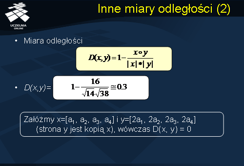 Wróćmy do problemu grupowania dokumentów tekstowych (np. stron WWW), o którym wspominaliśmy już wcześniej. Założyliśmy, że każdy dokument jest opisany w postaci wektora słów pochodzących z pewnego słownika, nazywanego tezaurusem. Każdy dokument, w tej reprezentacji, można interpretować jako punkt w przestrzeni wielowymiarowej, w której pojedynczy wymiar odpowiada jednemu słowu z przyjętego słownika. Współrzędne dokumentu w tej przestrzeni są zdefiniowane względną częstością występowania słów ze słownika. Podobieństwo (lub inaczej mówiąc, odległość) D(x, y) dokumentów x i y można zdefiniować jako znormalizowany iloczyn skalarny wektorów reprezentujących x i y, tj. jako iloczyn skalarny obu wektorów podzielony przez iloczyn ich rozmiarów. Tak zdefiniowaną miarę nazywamy miarą kosinusową. Rozważmy następujący przykład. Załóżmy, że tezaurus składa się z 4 słów. Dokumenty x i y są opisane następującymi wektorami słów: x=[2, 0, 3, 1] i y=[5, 3, 2, 0]. Iloczyn skalarny dokumentów x i y wynosi 16.