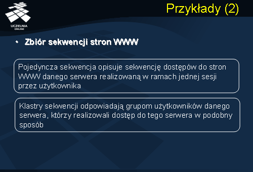 Rozważmy ponownie problem grupowania sekwencji dostępów do stron WWW, o którym wspominaliśmy już wcześniej. Definicja odległości (podobieństwa) sekwencji symboli powinna uwzględniać fakt, że sekwencje mogą mieć różną długość oraz różne symbole na tych samych pozycjach, np.: sekwencja x= abcde oraz sekwencja y= bcdxye. Popularną miarą odległości stosowaną do oceny podobieństwa sekwencji symboli jest tzw. miara LCS (ang. ang. longest common subsequence) – najdłuższej wspólnej podsekwencji. Odległość pomiędzy sekwencjami x i y definiujemy następująco: D(x, y) = |x| + |y| - 2 |LCS(x, y)|. Przykładowo, odległość pomiędzy sekwencją x= abcde a sekwencją y= bcdxye wynosi: