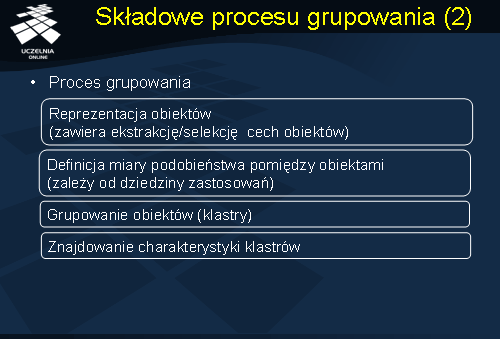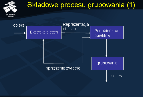 Proces grupowania jest procesem wieloetapowym i iteracyjnym. Punktem wyjścia jest charakterystyka zbioru grupowanych obiektów. Najczęściej, obiekt jest opisany licznym zbiorem bardzo heterogenicznych atrybutów o różnym stopniu znaczenia. Stąd, pierwszym etapem procesu jest wybór cech (atrybutów), które najlepiej charakteryzują dany typ obiektu. Wybór cech zależy również od celu grupowania. Przykładowo, grupując dokumenty tekstowe, informacja o dacie utworzenia dokumentu może być istotna, jeżeli proces grupowania ma uwzględniać datę, lub nie, jeżeli grupowanie ma na celu jedynie pogrupowanie tematyczne dokumentów. W wyniku selekcji cech otrzymujemy pewną abstrakcyjną reprezentację dokumentów. Kolejnym etapem procesu grupowania jest określenie miary podobieństwa pomiędzy grupowanymi obiektami. Miara ta silnie zależy od typu obiektów oraz od wybranej grupy cech opisujących obiekty – cechy mogą być opisane atrybutami kategorycznymi, liczbowymi, zbiorami danych, atrybutami sekwencyjnymi, czy wreszcie, atrybutami o charakterze multimedialnym.