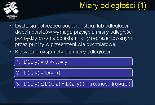Jak wynika z przedstawionego opisu składowych procesu grupowania, pierwszym etapem procesu jest ekstrakcja cech obiektów. Z braku miejsca i czasu, pominiemy ten etap procesu. Informacje na temat metod ekstrakcji cech można znaleźć w wielu podręcznikach dotyczących eksploracji i analizy danych. Kolejnym etapem jest etap wyboru miary podobieństwa pomiędzy obiektami. Najczęściej, podobieństwo dwóch obiektów, w procesie grupowania, definiujemy jako odległość dwóch obiektów zgodnie z pewną przyjęta miarą odległości. Przyjęta miara odległości, zależna od typu i charakterystyki grupowanych obiektów, powinna spełniać trzy podstawowe aksjomaty miary odległości (tzw. aksjomaty metryki). Po pierwsze, odległość obiektu x od obiektu y, D(x, y) = 0, wtedy i tylko tedy, gdy x=y. Miara odległości powinna być symetryczna, tj. D(x, y) = D(y, x). Wreszcie, miara odległości powinna spełniać nierówność trójkąta, tj D(x, y) ? D(x, z) + D(z, y). Przejdziemy obecnie do krótkiego przedstawienia i omówienia wybranych miar odległości.