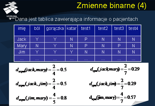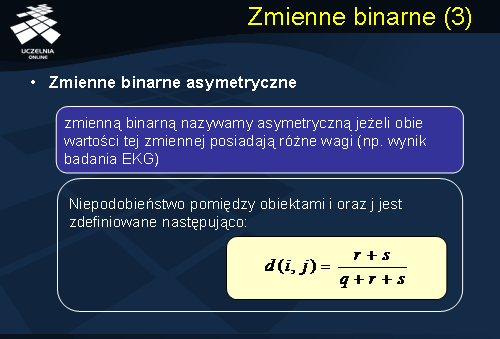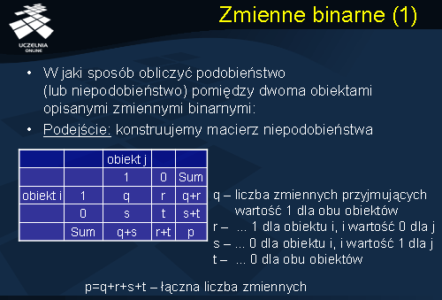 Przejdziemy obecnie do przedstawienia miar podobieństwa (lub niepodobieństwa) dla obiektów opisanych zmiennymi binarnymi. Dane są dwa obiekty „obiekt i” i „obiekt j”, oba opisane zbiorem p zmiennych binarnych. Konstruujemy macierz niepodobieństwa, przedstawioną na slajdzie, gdzie: q oznacza liczbę zmiennych przyjmujących wartość 1 dla obu obiektów, r oznacza liczbę zmiennych przyjmujących wartość 1 dla obiektu i, i wartość 0 dla obiektu j, s oznacza liczbę zmiennych przyjmujących wartość 0 dla obiektu i, i wartość 1 dla obiektu j, i t oznacza liczbę zmiennych przyjmujących wartość 0 dla obu obiektów.