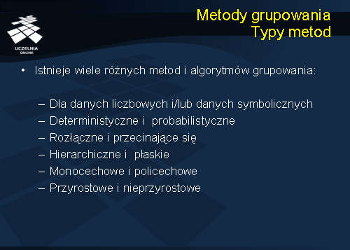 Istnieje wiele metod i algorytmów grupowania. Istnieje również wiele klasyfikacji algorytmów grupowania, które biorą pod uwagę różne aspekty procesy grupowania. Algorytmy grupowania możemy podzielić ze względu na grupowane typy danych. Stąd, mamy algorytmy grupowania danych liczbowych, danych symbolicznych, danych tekstowych, multimedialnych, itd. Inna klasyfikacja dzieli algorytmy grupowania ze względu na mechanizm generowania klastrów. Zgodnie z tą klasyfikacja algorytmy grupowania dzielimy na algorytmy deterministyczne oraz probabilistyczne. W algorytmach deterministycznych proces grupowania opiera się o mechanizm optymalizacji błędu średniokwadratowego realizowany metodą tradycyjną, w algorytmach probabilistycznych mechanizm ten opiera się na penetracji przestrzeni stanów wszystkich możliwych podziałów zbioru grupowanych obiektów. Algorytmy grupowania możemy podzielić, ze względu na charakterystykę wynikowych klastrów, na: algorytmy generujące klastry rozłączne i algorytmy generujące klastry przecinające się. Algorytmy grupowania możemy podzielić, ze względu na sposób otrzymywania klastrów, na algorytmy hierarchiczne oraz algorytmy płaskie. Algorytmy hierarchiczne generują sekwencję klastrów; w przypadku algorytmów płaskich, liczba klastrów nie ulega zmianie w kolejnych iteracjach algorytmu, zmienia się natomiast przydziałów obiektów do klastrów. Algorytmy grupowania można podzielić, ze względu na sposób, ściślej mówiąc, kolejność, wykorzystania cech obiektów w procesie grupowania, na algorytmy monoteiczne i politeiczne.