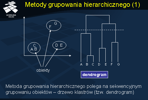 Jak wspomnieliśmy wcześniej, metoda grupowania hierarchicznego polega na sekwencyjnym grupowaniu obiektów. Sekwencja operacji grupowania tworzy tak zwane drzewo klastrów, nazywane dendrogramem. Dendrogram przedstawiony na slajdzie ilustruje działanie hierarchicznego aglomeracyjnego algorytmu grupowania. Początkowo, wszystkie obiekty A, B, ... G należą do osobnych klastrów. Następnie, w kolejnych krokach, klastry są łączone w większe klastry (łączymy B i C, D i E, oraz F i G, następnie, A łączymy z klastrem zawierającym obiekty B i C, itd.). Proces łączenia klastrów jest kontynuowany tak długo, aż liczba uzyskanych klastrów nie osiągnie zadanej liczby klastrów. Graficznie, na dendrogramie, warunek stopu (tj. zadana liczba klastrów) przedstawia linia pozioma przecinająca dendrogram. Na analizowanym slajdzie, zadana liczba klastrów wynosi 3. W wyniku grupowania otrzymujemy 3 klastry obiektów: C1, C2 i C3, gdzie klaster C1={A, B, C}, C2={D, E} oraz C3={F, G}.