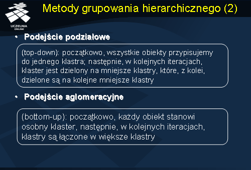 W obu podejściach, aglomeracyjnym i podziałowym, liczba klastrów jest ustalona z góry przez użytkownika i stanowi warunek stopu procesu grupowania. W praktyce, hierarchiczne algorytmy podziałowe nie są stosowane ze względu na problem podziału klastra. Problem ten można sformułować następująco. Dany jest klaster obiektów. w jaki sposób podzielić klaster na dwa klastry tak, aby optymalizować przyjętą funkcję kryterialną? Pamiętajmy, że w każdym kroku algorytmu podziałowego mamy M klastrów. Który z podziałów jest najlepszy? Stąd, najpopularniejszą i, de facto, jedyną grupą hierarchicznych algorytmów stosowaną w praktyce są algorytmy aglomeracyjne. W przypadku algorytmów aglomeracyjnych podstawowym problemem jest problem łączenia klastrów. Które klastry połączyć i utworzyć większy klaster? Odpowiedź wydaje się, na pierwszy rzut oka, oczywista – należy połączyć dwa „najbliższe” klastry. Co to znaczy „najbliższe”? W jaki sposób zdefiniować odległość pomiędzy klastrami?