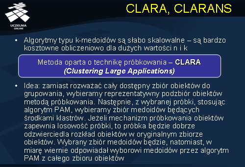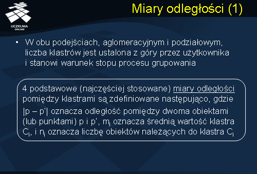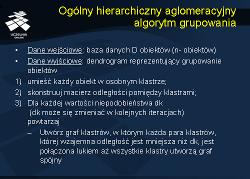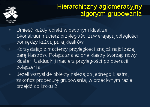 Przedstawiony na slajdzie algorytm reprezentuje uproszczoną wersję ogólnego hierarchicznego aglomeracyjnego algorytmu grupowania. Podobnie jak w przypadku ogólnego algorytmu grupowania, w kroku pierwszym, każdy obiekt jest umieszczany w osobnym klastrze. Następnie, konstruowana jest macierz odległości pomiędzy klastrami. Znajdowana jest para najbliższych klastrów, zgodnie z przyjętą miara odległości. Znalezione klastry są łączone tworząc nowy klaster. Aktualizowana jest macierz odległości pomiędzy klastrami i poszukiwana jest kolejna para najbliższych klastrów. Proces łączenia klastrów powtarza się, aż do osiągnięcia zadanej liczby klastrów. W przedstawionym algorytmie można wykorzystać dowolną z omówionych uprzednio miar odległości. Jeżeli miarą odległości pomiędzy klastrami jest „minimalna odległość”, to mówimy o algorytmie grupowania typu „single link” lub „single linkage”. Jeżeli miarą odległości jest „maksymalna odległość”, to mówimy o algorytmie grupowania typu „complete link” lub „complete linkage”. W przypadku przyjęcia miary „średniej odległość” mówimy o algorytmie typu „average link” lub „average linkage”. W zależności od przyjętej miary odległości uzyskujemy klastry o różnym kształcie.
