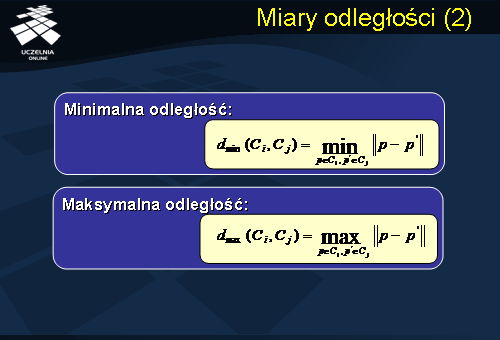 Cztery podstawowe (najczęściej stosowane) miary odległości pomiędzy klastrami to: odległość minimalna, odległość maksymalna, odległość średnich oraz średnia odległość. Odległość minimalna pomiędzy klastrami C1 i C2 to minimalna z odległości pomiędzy dwoma dowolnymi obiektami p1 i p2, gdzie p1 należy do klastra C1 a p2 należy do klastra C2. Odległość maksymalna pomiędzy klastrami C1 i C2 to maksymalna z odległości pomiędzy dwoma dowolnymi obiektami p1 i p2, gdzie p1 należy do klastra C1 a p2 należy do klastra C2. W przypadku odległości średnich, odległość pomiędzy klastrem C1 a klastrem C2 definiujemy jako odległość ich średnich. W przypadku średniej odległości, odległość pomiędzy klastrem C1 a klastrem C2 definiujemy jako średnią odległość pomiędzy wszystkimi parami obiektów p1 i p2, gdzie p1 należy do klastra C1, natomiast p2 do klastra C2.