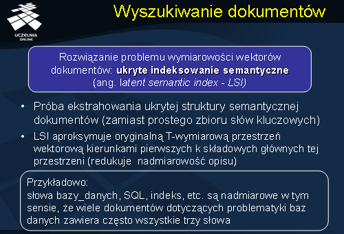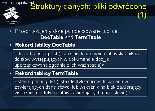 lub <słowo-lista_wskaźników>. Słowa są kluczami wyszukiwania, natomiast wskaźnik wskazuje na blok zawierający wskaźniki do dokumentów zawierających dane słowo (rozwiązanie przedstawione na slajdzie). W przypadku pary słowo-lista_wskaźników, lista wskaźników wskazuje bezpośrednio na dokumenty zawierające dane słowo. Tablica DicTable jest uzupełnieniem tablicy TermTable. Rekordy tablicy DocTable składają się z par <doc_id, lista słów kluczowych> lub lista wskaźników do słów kluczowych występujących w dokumencie doc_id, uporządkowana zgodnie z ich ważnością. W bloku zawierającym, dla danego słowa, wskaźniki do dokumentów zawierających dane słowo, umieszcza się również pewne dodatkowe dane o samym wystąpieniu słowa (np. częstość występowania słowa danym dokumencie, waga TF-IDF slowa). Wyszukiwanie jest realizowane w oparciu o słowa.