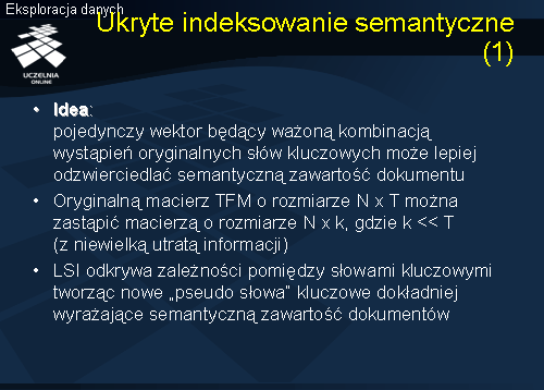 Niniejszy slajd przedstawia nową reprezentację macierzy M (macierz B), która odpowiada dwóm pierwszym kolumnom macierzy U w rozkładzie SVD macierzy M. Kolumny nowej reprezentacji odpowiadają nowym pseudo-słowom powstałym jako ważona kombinacja oryginalnych słów kluczowych. Zauważmy, że w nowej dwu-wymiarowej przestrzeni dokumenty wyraźnie grupują się w dwóch klastrach, co przedstawia schematyczny rysunek zamieszczony na slajdzie. Okazuje się, analizując składowe główne nowej przestrzeni, że pierwsze pseudo-słowo uwzględnia w większym stopniu (nadaje im największe wagi) dwa pierwsze słowa kluczowe: bazy_danych i SQL, natomiast drugie uwzględnia w większym stopniu słowa kluczowe regresja, wiarygodność i liniowa. Stąd, pierwszy klaster jest utworzony przez dokumenty związane z problematyką bazodanową, natomiast drugi z klastrów zawiera głównie dokumenty związane z analizą danych. Zaletą zastosowanej aproksymacji jest znalezienie, stąd nazwa techniki – ukryte indeksowanie semantyczne, niejawnego związku pomiędzy dokumentami, które w oryginalnej reprezentacji są mało podobne do siebie. Rozważmy dwa dokumenty d11 i d12, z których dokument d11 zawiera słowo kluczowe bazy_danych (niech częstość wynosi 10), natomiast dokument d12 zawiera słowo kluczowe SQl (niech częstość wynosi również 10). W oryginalnej reprezentacji TF, oba dokumenty będą mało podobne do siebie, ponieważ nie zawierają żadnych wspólnych słów. W nowej reprezentacji, oba dokumenty znacznie się do siebie zbliżą, gdyż oba dotyczą tej samej problematyki bazodanowej. Ta zaleta ukrytego indeksowania semantycznego przejawia się również w odniesieniu do zapytań. Gdybyśmy zdefiniowali zapytanie o dokumenty dotyczące baz danych w odniesieniu do oryginalnej reprezentacji, to dokument d12, jako nie zawierający słowa kluczowego nie pojawiłby się w wyniku zapytania. W przypadku nowej reprezentacji, jako dokument odnoszący się do problematyki baz danych, dokument d12 znalazłby się w wyniku zapytania.
