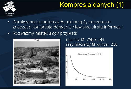 Aproksymacja macierzy A macierzą Ak pozwala na znaczącą kompresję danych z niewielką utratą informacji. Rozważmy przykład zdjęcia przedstawionego na slajdzie. Reprezentacją zdjęcia jest macierz M o rozmiarze 254 x 264. Rząd macierzy M wynosi 256. Macierz M można przedstawić jako sumę iloczynów si * ui * vi (transponowane), po i od 1 do 256, gdzie każdy ze składników jest macierzą rzędu 1.