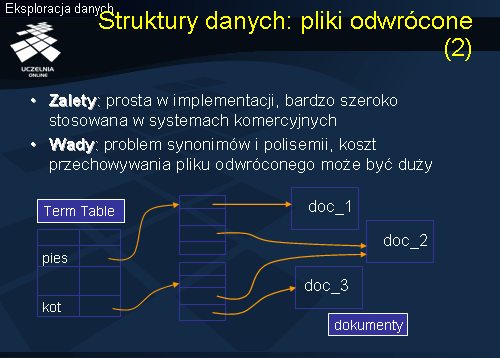 , wyszukiwany jest odpowiedni rekord tej tablicy zawierający wskaźnik do bloku wskaźników. Jeżeli szukamy dokumentów zawierających słowa kluczowe <pies> i <kot>, znajdujemy wskaźniki do dokumentów zawierających, odpowiednio, słowa kluczowe. Dokumenty, które zawierają oba wymienione słowa kluczowe są wskazywane przez wskaźniki należące do obu zbiorów wskaźników. Główną zaletą omawianej struktury jest prostota implementacji pliku odwróconego. Struktura ta jest bardzo szeroko stosowana w systemach komercyjnych, zarówno systemów tekstowych baz danych jak i systemów wyszukiwania informacji. Wadą tej struktury jest problem synonimów i polisemii oraz koszt przechowywania pliku odwróconego.