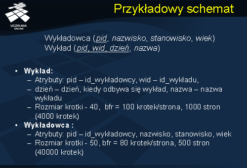 Zanim przejdziemy do prezentacji dalszych reguł transformacji, wprowadzimy obecnie przykładową bazę danych, do której będziemy się odwoływać w dalszej części wykładu. baza danych składa się z dwóch relacji: Wykładowca i Wykład. Kluczami relacji są atrybuty podkreślone linią ciągłą. Na slajdzie podane są rozmiary obu relacji.