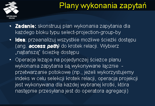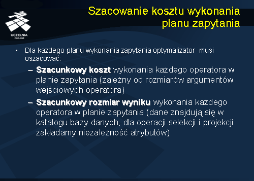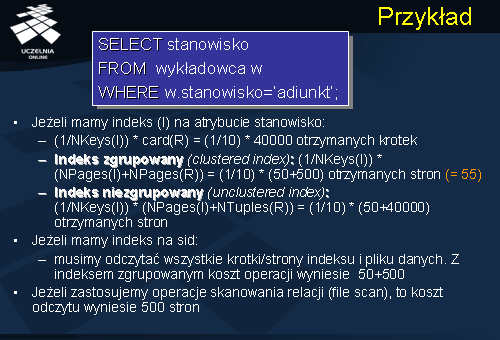 Optymalizator rozpoczyna analizę możliwych ścieżek dostępu do relacji Wykładowca . Jeżeli w systemie został zdefiniowany indeks (I) na atrybucie stanowisko relacji Wykładowca , to wówczas jedną z możliwych ścieżek dostępu do tej relacji jest dostęp poprzez zdefiniowany indeks. Oszacowanie kosztu dostępu do relacji za pomocą indeksu zależy od typu indeksu. Jeżeli jest to indeks gęsty, wówczas, zgodnie ze wzorem przedstawionym na slajdzie 11, wynikowy rozmiar selekcji wynosi 1/10 * 40000 (liczba krotek relacji Wykładowca ) = 4000 krotek. Liczba operacji odczytu stron bazy danych zależy od typu indeksu – czy jest to indeks zgrupowany czy tez indeks nie zgrupowany. Oszacowanie liczby odczytywanych stron, dla tych dwóch typów indeksów, przedstawiono na slajdzie. W przypadku, gdy w systemie został zdefiniowany indeks (I) na kluczu relacji Wykładowca (sid), ale brak indeksu na atrybucie stanowisko , wówczas należy odczytać wszystkie strony indeksu i relacji. Liczba odczytanych stron wynosi wówczas 550 stron. W przypadku, gdy nie dysponujemy indeksem na relacji Wykładowca , pozostaje operacja skanowani relacji, której koszt wynosi 500 stron. Po przeanalizowaniu wszystkich możliwych ścieżek dostępu, optymalizator wybiera ścieżkę o „najmniejszym” koszcie.