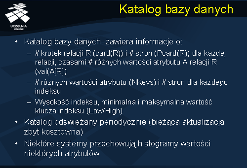 – liczbie krotek każdej relacji R (card(R)) i liczbie stron (Pcard(R)) dla każdej relacji, czasami katalog przechowuje również informacje o liczbie różnych wartości każdego atrybutu relacji (val(A[R]),
