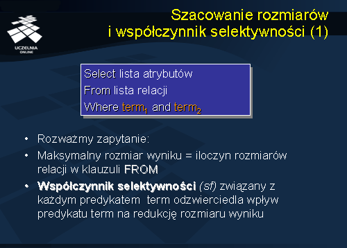 –Szacunkowy rozmiar wyniku wykonania każdego operatora w planie zapytania (dane znajdują się w katalogu bazy danych, dla operacji selekcji i projekcji zakładamy niezależność atrybutów).