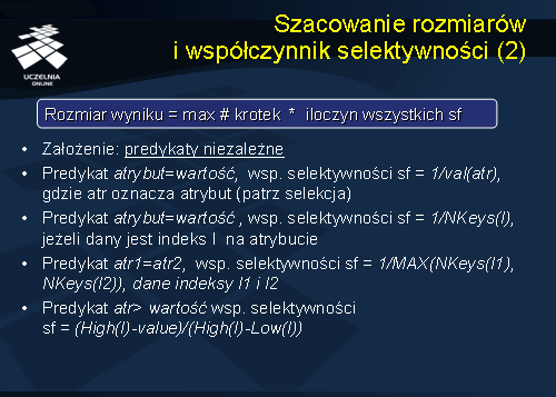 Wartości współczynnika selektywności, dla poszczególnych typów predykatów przedstawiono na slajdzie. Przykładowo, jeżeli predykat term posiada postać „atrybut = wartość”, wówczas wartość współczynnika selektywności wynosi 1/val(atrybut), gdzie val(atrybut) oznacza liczbę różnych wartości danego atrybutu. Załóżmy, że predykat posiada postać „miasto = ‘Konin’ i val(miasto) = 5 (atrybut miasto przyjmuje 5 różnych wartości). Wówczas, szacunkowa liczba krotek spełniających dany predykat wynosi 1/5 liczby krotek. Przykładowo, jeżeli dana relacja Pracownicy posiada 1000 krotek i zapytanie do relacji jest sformułowane następująco: