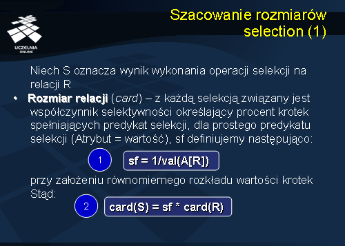 Niech S oznacza wynik wykonania operacji selekcji na relacji R. Niech card oznacza rozmiar relacji. Wówczas, dla prostego predykatu selekcji (Atrybut = wartość),