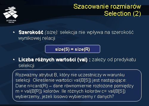 - Projekcja na pojedynczym atrybucie A: rozmiar wyniku zapytania S (card(S) = val(A[R])) jest równy liczbie różnych wartości atrybutu A w relacji R.