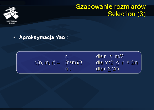 Dane: n=1000 (krotek relacji Pracownicy), m=10 (różnych stanowisk), r =200 = card(S) (rozmiar wyniku zapytania). Stąd, zgodnie z aproksymacją Yao, val(stanowisko[S]) = m = 10.