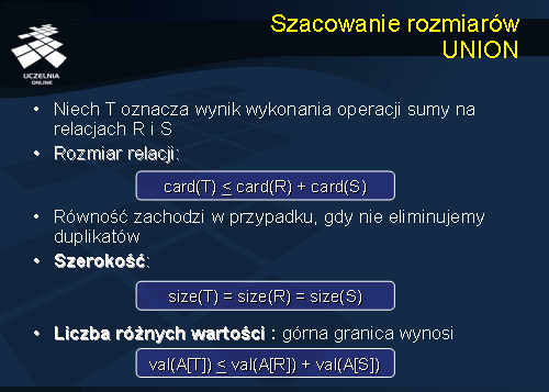 Górne ograniczenie rozmiaru relacji T wynosi: card(T) <= card(R) + card(S). Równość zachodzi w przypadku, gdy nie eliminujemy duplikatów. Szerokość relacji T wynosi: size(T) = size(R) = size(S).