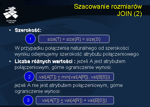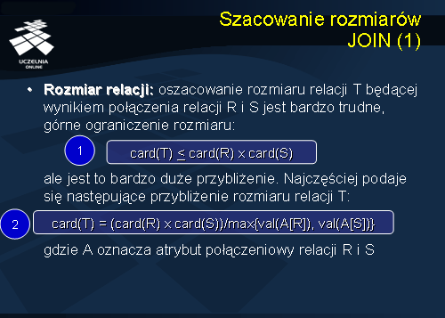 card(T) = (card(R) * card(S))/max{val(A[R]), val(A[S])}, gdzie A oznacza atrybut połączeniowy relacji R i S.