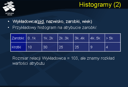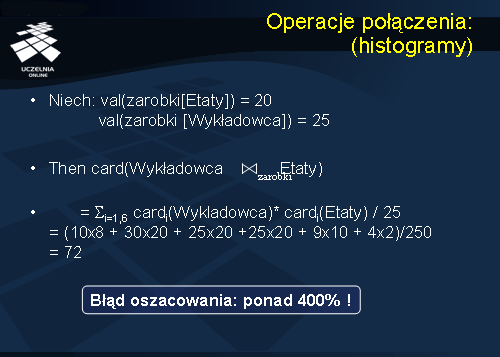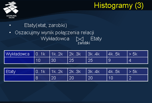 Oszacowanie rozmiaru wyniku wykonania operacji połączenia relacji Wykładowca i Etaty , z wykorzystaniem przedstawionych wcześniej histogramów, daje 72 krotki. Zauważmy, że błąd oszacowania poprzednią metodą jest ponad 400 razy większy! Ten przykład ilustruje przydatność histogramów do szacowania wyniku wykonania operacji połączenia.
