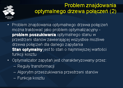 Jak już wspominaliśmy, większość komercyjnych systemów zarządzania bazami danych ogranicza się do analizy drzew lewostronnie zagnieżdżonych. Mimo przyjęcia określonego kształtu drzewa połączeń, nadal liczba możliwych drzew, które należy przeanalizować, i których koszt należy oszacować, może być bardzo duża. Pozostaje zatem problem wyboru strategii przeszukiwania przestrzeni możliwych drzew połączeń. Funkcja kosztu, stosowana przez optymalizatory, opiera się na oszacowaniach rozmiarów wyników operatorów, które przedstawiliśmy ma poprzednich slajdach.