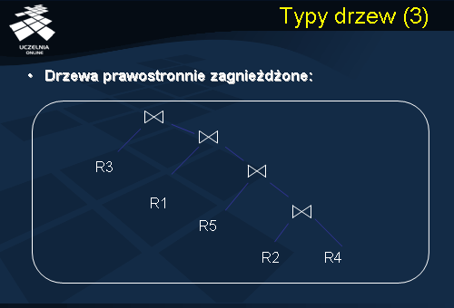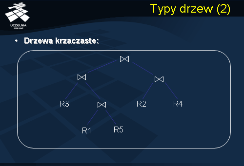 Istnieje wiele struktur drzew połączeń. Większość komercyjnych systemów baz danych dopuszcza tylko niektóre z nich. Krótko przedstawimy możliwe i stosowane drzewa połączeń. Podstawowym typem drzew połączeń, stosowanym przez większość optymalizatorów zapytań, są tak zwane drzewa lewostronnie zagnieżdżone (ang. left deep join tree). Cechą charakterystyczną tych drzew jest to, że sekwencja operacji połączenia jest wykonywana w sposób potokowy. Relacje (lub wyniki wykonania bloków zapytania) są zmaterializowane (relacje R3, R1, R5, R2, R4). Po połączeniu relacji R3 z R1, krotki tego połączenia mogą być przetwarzane potokowo – są one łączone z krotkami relacji, będącymi prawymi argumentami operacji połączenia. Zauważmy, że krotki otrzymywane w wyniku połączenia nie muszą być materializowane! Są one natychmiast konsumowane przez następny operator połączenia. Co więcej, w procesie łączenia relacji można wykorzystać indeksy na relacjach będących prawymi argumentami operacji połączenia. Większość systemów zarządzania bazami danych opuszcza tylko i wyłącznie drzewa tego typu. Dlaczego? Liczba możliwych drzew połączeń dla n relacji może być bardzo duża, natomiast liczba drzew lewostronnie zagnieżdżonych jest znacznie mniejsza. W przypadku n relacji istnieje tylko jeden kształt drzewa zagnieżdżonego, do którego można dopasować relacje na n silnia sposobów.