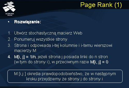 Schemat działania algorytmu Page Rank jest następujący. Utwórz stochastyczną macierz Web oznaczoną przez M: Ponumeruj wszystkie strony. Strona i odpowiada i-tej kolumnie i i-temu wierszowi macierzy M. Element M[i, j] = 1/n, jeżeli strona j posiada linki do n stron (w tym do strony i), w przeciwnym razie M[i, j] = 0. Zauważmy, że wartość elementu M [i,j ] określa prawdopodobieństwo, że w następnym kroku przejdziemy ze strony j do strony i. Obliczanie ważności stron ma charakter iteracyjny i polega na wymnażaniu wektora ważności stron przez macierz M.