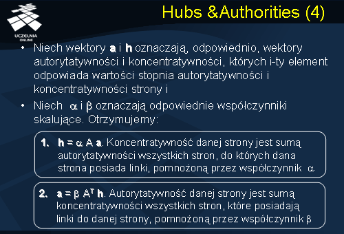 h oznaczają, odpowiednio, wektory autorytatywności i koncentratywności stron, których i-ty element odpowiada wartości stopnia autorytatywności i koncentratywności strony i. Niech alfa i beta oznaczają odpowiednie współczynniki skalujące. Z definicji typów stron, przedstawionych poprzednio, otrzymujemy, że