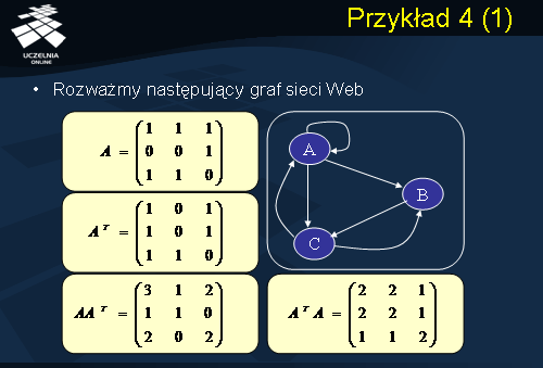 Dla ilustracji działania algorytmu H & A rozważmy prosty przykład przedstawiony na slajdzie. Załóżmy, że Web składa się z 3 stron: A, B, i C. Graf przedstawiony na slajdzie przedstawia strukturę połączeń pomiędzy stronami. Macierz A naszej uproszczonej sieci Web przedstawiono na slajdzie. Przykładowo, wiersz 1 macierzy A zawiera następujące elementy: 1, 1 i 1. Elementy A[1, 1] = A[1, 2] = A[1, 3] = 1, gdyż strona A (z numerem 1) posiada linki wychodzące do stron A, B (z numerem 2) i C (z numerem 3). Wiersz 2 macierzy A zawiera następujące elementy: 0, 0, i 1. Elementy A[2, 1] = A[2, 2] = 0, gdyż strona B nie posiada linków wychodzących do stron A i B, natomiast element A[2, 3] = 1, gdyż strona B posiada link wychodzący do strony C. Wreszcie, wiersz 3 macierzy A zawiera elementy: 1, 1, i 0. Elementy A[3, 1] = A[3, 2] = 1, gdyż strona C posiada linki wychodzące do stron A i B, natomiast element A[3, 3] = 0, gdyż strona C nie posiada linku do siebie. Na slajdzie przedstawiono również macierze: A(transponowane) oraz iloczyny macierzy A * A(transponowane) oraz A(transponowane)* A.