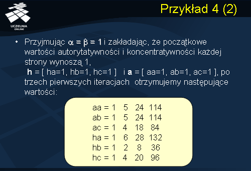 a = aa=1, ab=1, ac=1], po trzech pierwszych iteracjach otrzymujemy następujące wartości autorytatywności i koncentratywności stron: