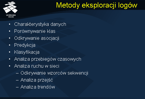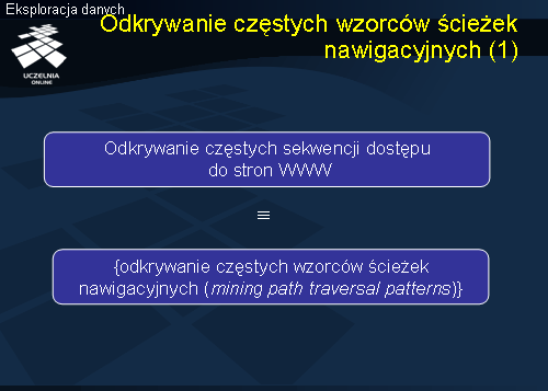 Przejdziemy obecnie do omówienia problemów i metod eksploracji danych opisujących korzystanie z sieci Web. Celem eksploracji danych opisujących korzystanie z zasobów sieci Web jest odkrywanie ogólnych wzorców zachowań użytkowników sieci Web, w szczególności, wzorców dostępu do stron (istnieje szereg narzędzi komercyjnych jak i ogólnodostępnych eksploracji logów serwerów WWW - WUM, WEBMiner, WAP, WebLogMiner). Odkryta wiedza pozwala na: budowę adaptatywnych serwerów WWW (personalizacja usług serwerów WWW – przykładem serwer firmy Amazon), optymalizację struktury serwera i poprawę nawigacji (stosowana w Yahoo), czy wreszcie, znajdowanie potencjalnie najlepszych miejsc reklamowych (znając wzorce zachowań klientów i ich preferencje konsumenckie).