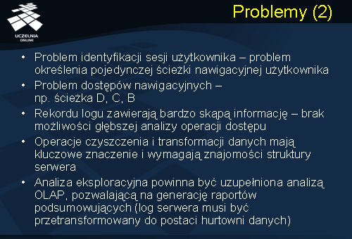 Jak już wspomnieliśmy, przedstawiony algorytm ma charakter ogólny i celem przedstawienia algorytmu było zilustrowanie mechanizmu eksploracji logu. Szczegółowa implementacja algorytmów eksploracji logów wymaga rozwiązania szeregu trudnych problemów. Pierwszym problemem wymagającym rozwiązania jest problem identyfikacji pojedynczej ścieżki nawigacyjnej użytkownika. Otóż, w ramach pojedynczej sesji, użytkownik może realizować, de facto, wiele ścieżek nawigacyjnych: np. poszukuje książek poświęconych eksploracji danych, a następnie, w ramach tej samej sesji, rozpoczyna poszukiwanie książek dotyczących sieci komputerowych. Problem identyfikacji pojedynczej ścieżki nawigacyjnej wiąże się z problemem identyfikacji dostępów nawigacyjnych, np. ścieżka D, C, B. Reasumując, transformacja sesji użytkownika w zbiór maksymalnych ścieżek nawigacyjnych „w przód” jest problemem trudnym, który, dodatkowo, wymaga znajomości struktury serwera. Ograniczenia algorytmów eksploracji logów wynikają, również, z ograniczonej informacji dostępnej w pliku logu. Rekordu logu zawierają bardzo skąpą informację, stąd, brak możliwości głębszej analizy operacji dostępu.