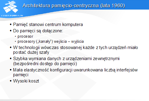 Zgodnie z nazwą, centralnym elementem struktury jest pamięć, wyposażona w kilka portów, umożliwiających połączenie jej z kilkoma urządzeniami. Urządzeniami tymi są procesor (lub procesory) i tzw. kanały wejścia-wyjścia, czyli specjalizowane procesory transmitujące dane pomiędzy urządzeniami zewnętrznymi i pamięcią komputera.