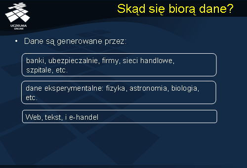 Rozwój technologii systemów baz danych, magazynów danych, sieci komputerowych, automatycznych narzędzi do gromadzenia danych, z jednej strony, z drugiej, upowszechnienie systemów informatycznych związane ze wzrostem świadomości użytkowników i znaczącym spadkiem cen sprzętu komputerowego, zaowocowały nagromadzeniem olbrzymich wolumenów danych przechowywanych w bazach danych, hurtowniach danych i różnego rodzaju repozytoriach danych. Postęp technologiczny w zakresie cyfrowego generowania i gromadzenia informacji doprowadził do przekształcenia się baz danych wielu przedsiębiorstw, urzędów i placówek badawczych w zbiorniki ogromnych ilości danych.