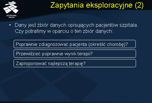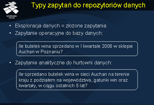 Możemy wyróżnić trzy typy zapytań do repozytoriów danych w szczególności do systemów baz danych. Są to zapytania operacyjne, zapytania analityczne oparte o model OLAP oraz zapytania eksploracyjne. Typowym zapytaniem operacyjnym do bazy danych będzie: „Ile butelek wina sprzedano w I kwartale 2006 w sklepie Auchan w Poznaniu”? Bardziej zaawansowanym zapytaniem będzie zapytanie analityczne postaci: „Ile sprzedano butelek wina w sieci Auchan na terenie kraju z podziałem na województwa, gatunki win oraz kwartały, w ciągu ostatnich 5 lat?” Analiza danych w magazynie danych, zgodnie z modelem OLAP, jest sterowana całkowicie przez użytkownika. Użytkownik formułuje zapytania i dokonuje analizy danych zawartych w magazynie. Z tego punktu widzenia, OLAP można interpretować jako rozszerzenie standardu SQL o możliwość efektywnego przetwarzania złożonych zapytań zawierających agregaty. Niestety, analiza porównawcza zagregowanych danych, która jest podstawą modelu OLAP, operuje na zbyt szczegółowym poziomie abstrakcji i nie pozwala na formułowanie bardziej ogólnych zapytań.