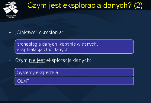 Rozważając czym jest eksploracja danych należy się również zastanowić czym ona nie jest. Czasami jest błędnie utożsamiana z systemami eksperckimi czy też analizą OLAP (Online Analytical Processing). Analiza danych sterowana zapytaniami (OLAP) zakłada, że użytkownik, po pierwsze, posiada pełną wiedzę o przedmiocie analizy, i, po drugie, potrafi sterować tym procesem. Eksploracja danych umożliwia analizę danych dla problemów, które, ze względu na swój rozmiar, są trudne do przeprowadzenia przez użytkownika, oraz tych problemów, dla których nie dysponujemy pełną wiedzą o przedmiocie analizy, co uniemożliwia sterowanie procesem analizy danych.