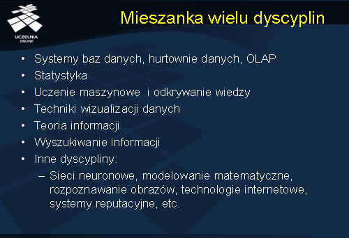 Eksploracja danych jest dziedziną informatyki, która integruje szereg dyscyplin badawczych, takich jak: systemy baz danych i hurtownie danych, statystyka, sztuczna inteligencja, obliczenia równoległe, optymalizacja i wizualizacja obliczeń. Powyższa lista dyscyplin nie jest pełna. Eksploracja danych wykorzystuje również szeroko techniki i metody opracowane na gruncie systemów wyszukiwania informacji, analizy danych przestrzennych, rozpoznawania obrazów, przetwarzania sygnałów, technologii Web, grafiki komputerowej, bioinformatyki. Różnorodność i wielość metod eksploracji danych, wywodzących się często z różnych dyscyplin badawczych, utrudnia potencjalnym użytkownikom identyfikację metod, które są najodpowiedniejsze z punktu widzenia ich potrzeb w zakresie analizy danych.
