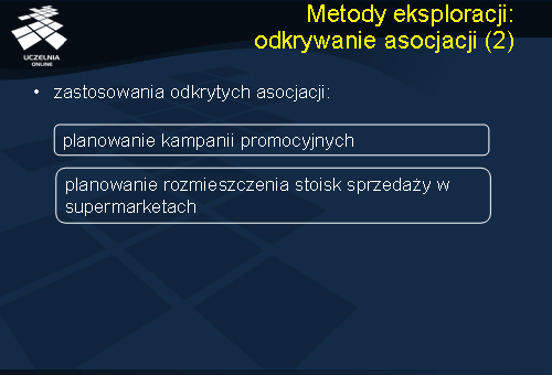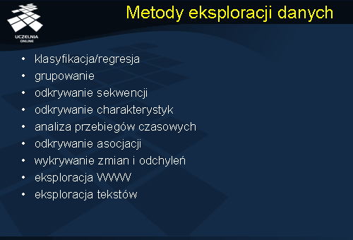 Odkrywanie asocjacji - najszersza klasa metod obejmująca, najogólniej, metody odkrywania interesujących zależności lub korelacji, nazywanych ogólnie asocjacjami, pomiędzy danymi w dużych zbiorach danych. Wynikiem działania metod odkrywania asocjacji są zbiory reguł asocjacyjnych lub wzorców sekwencji opisujących znalezione zależności i/lub korelacje. Klasyfikacja i predykcja - obejmuje metody odkrywania modeli (tak zwanych klasyfikatorów) lub funkcji opisujących zależności pomiędzy zadaną klasyfikacją obiektów a ich charakterystyką. Odkryte modele klasyfikacji są, następnie, wykorzystywane do klasyfikacji nowych obiektów o nieznanej klasyfikacji. Grupowanie (analiza skupień, klastrowanie) - obejmuje metody analizy danych i znajdowania skończonych zbiorów klas obiektów posiadających podobne cechy. Wykrywanie punktów osobliwych - obejmuje metody wykrywania (znajdowania) obiektów osobliwych, które odbiegają od ogólnego modelu danych (klasyfikacja i predykcja) lub modeli klas (analiza skupień). Często, metody wykrywania punktów osobliwych stanowią integralną część innych metod eksploracji danych, na przykład, metod grupowania. Analiza przebiegów czasowych - obejmuje metody analizy przebiegów czasowych w celu znalezienia: trendów, podobieństw, anomalii oraz cykli. Opisy koncepcji/klas - obejmuje metody znajdowania zwięzłych opisów lub podsumowań ogólnych własności klas obiektów. Znajdowane opisy mogą mieć postać reguł charakteryzujących lub reguł dyskryminacyjnych. W tym drugim przypadku, opisują różnice pomiędzy ogólnymi własnościami tak zwanej klasy docelowej (klasy analizowanej) a własnościami tak zwanej klasy (zbioru klas) kontrastującej (klasy porównywanej). Analiza trendów i odchyleń - obejmuje metody analizy danych zmiennych w czasie w celu znalezienia różnic pomiędzy aktualnymi a oczekiwanymi wartościami danych, anomalnych zmian wartości danych w czasie, itp. Eksplorację tekstu oraz Eksplorację WWW .