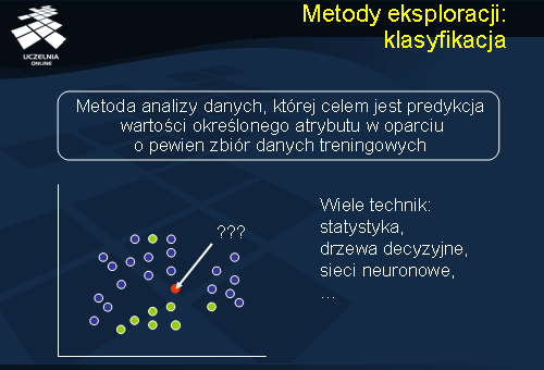 Przejdziemy obecnie do omówienia niektórych wybranych metod eksploracji danych. Rozpoczniemy od krótkiego omówienia metody klasyfikacji. Klasyfikacja jest metodą analizy danych, której celem jest predykcja wartości określonego atrybutu w oparciu o pewien zbiór danych treningowych. Obejmuje metody odkrywania modeli (tak zwanych klasyfikatorów) lub funkcji opisujących zależności pomiędzy zadaną klasyfikacją obiektów a ich charakterystyką. Odkryte modele klasyfikacji są, następnie, wykorzystywane do klasyfikacji nowych obiektów o nieznanej klasyfikacji.